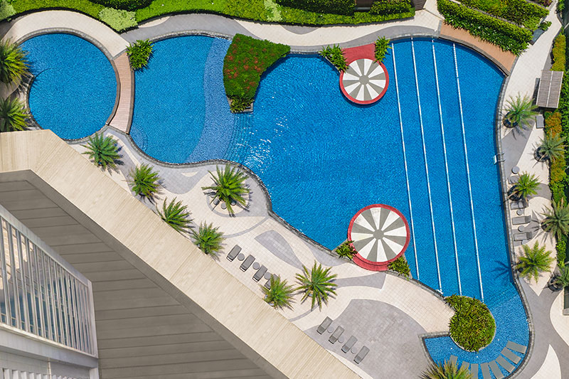 Our expansive, lagoon-style swimming pool features a children’s pool, a lap pool for fitness enthusiasts, and a recreational pool for leisurely swims. The veranda provides a comfortable spot for lounging, while sunbathing decks offer the perfect place to relax and soak up the sun. Guests can also enjoy refreshing drinks and light bites by the pool, making it an ideal spot to unwind throughout the day.